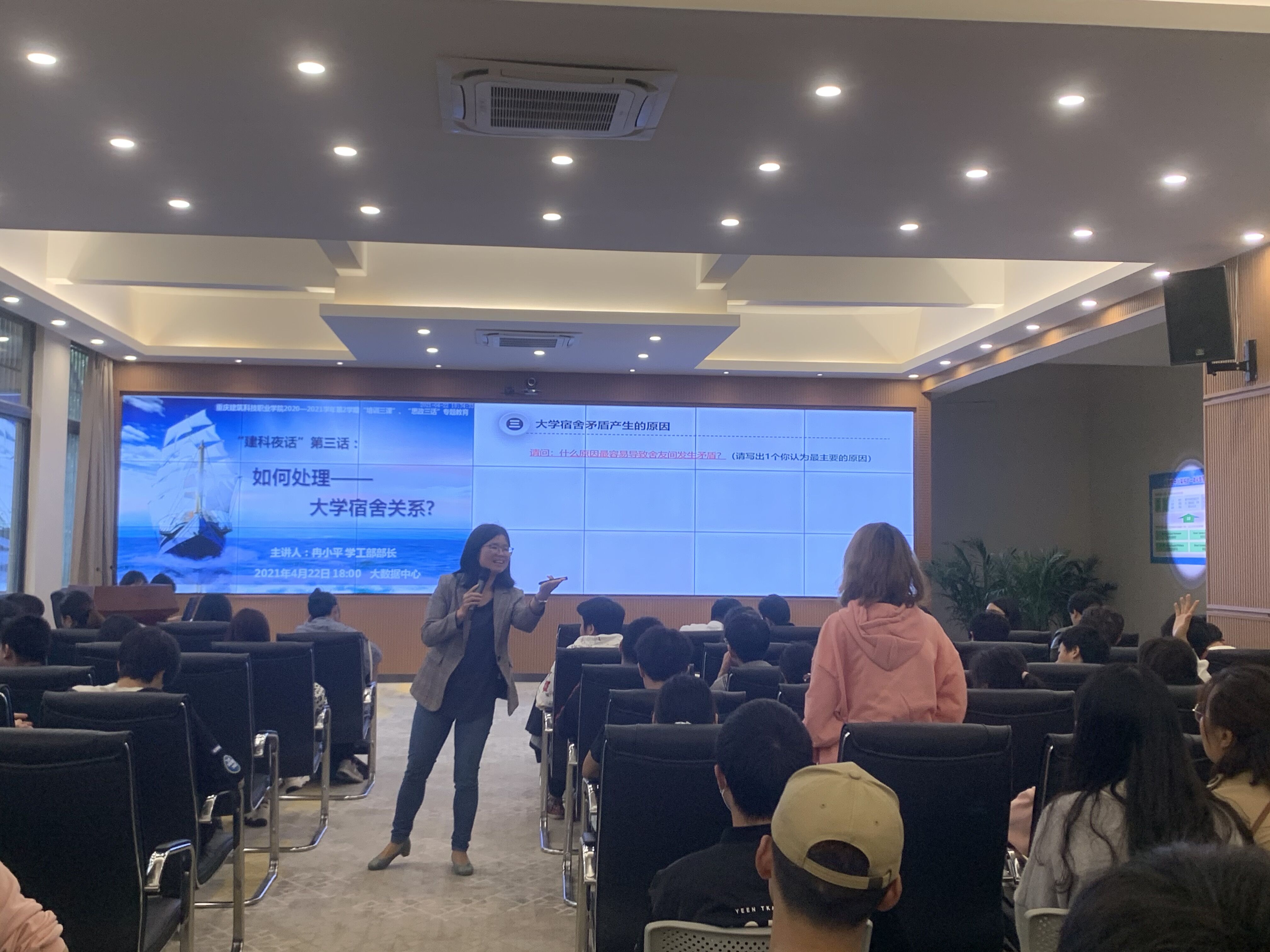 活动开始,冉小平部长为大家讲述了几例因宿舍关系处理不当而发生恶性事件的案例,随即同学们纷纷讲述自己所期待的寝室关系。紧接着冉处长用数据化信息展示宿舍关系现状并分析宿舍矛盾原因,结合同学们的反馈进入到“建言献策”环节。同学们积极发言,活动氛围如火如荼。最后冉处长为大家支招,希望同学们坚持三大“宝典”:思想上尊重各自的生活习惯,行为上互帮互助,态度上不为小事计较。坚持“四个关键词”为行为准则——尊重、理解、包容、改变。