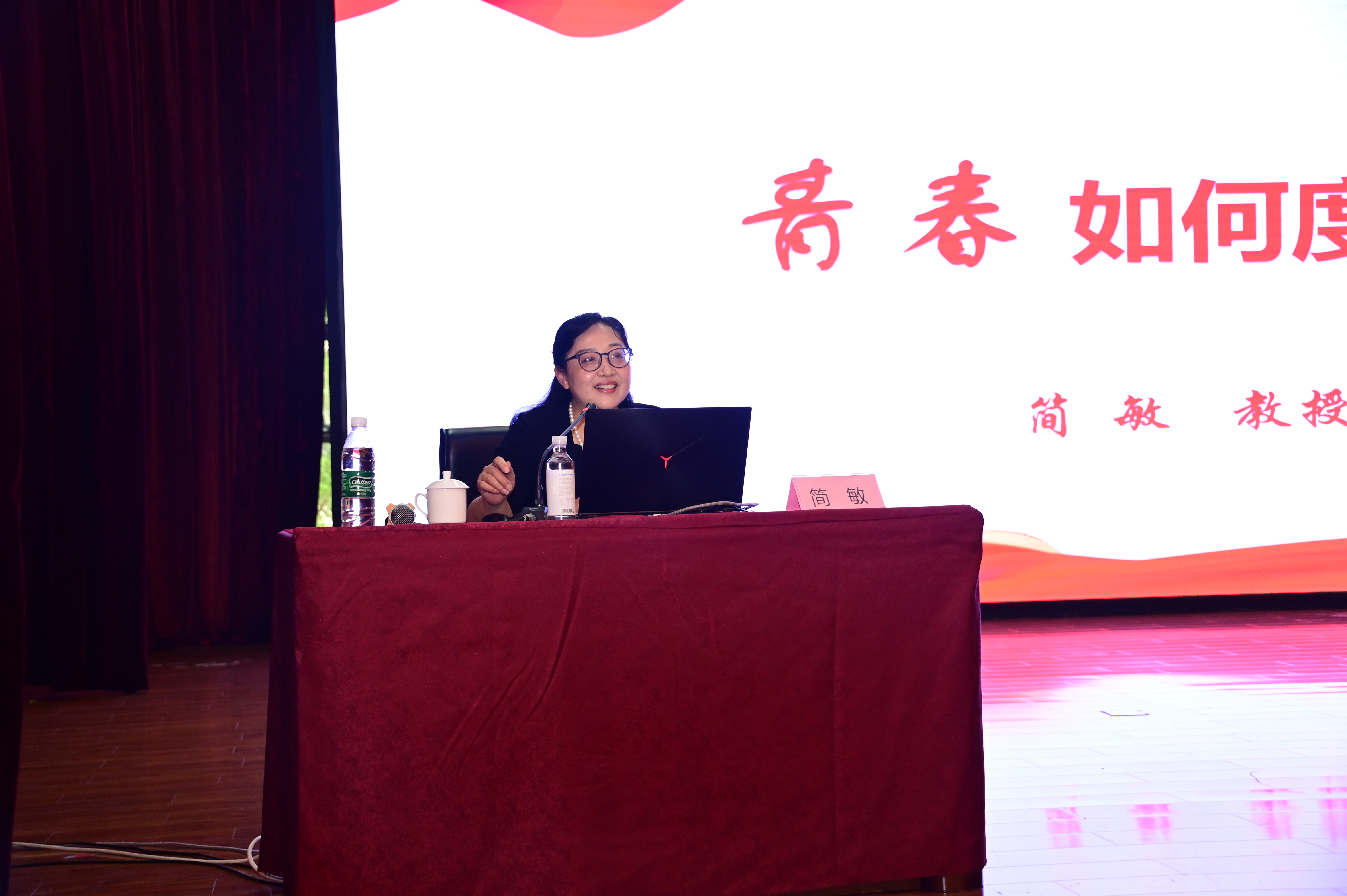 接下来,简敏教授先后以“峥嵘岁月 大浪淘沙”、“实践真知 寄语青年”、“责任担当 梦想使命”、“青春作伴 人生出彩”四个标题,开始阐述她心中的答案。这四个点分别是从“历史”、“实践”、“责任”、“未来”这四个角度的论述。从历史中她讲述了董必武等人的事迹,告诉了同学们信仰是多么的重要;从实践中,她引用了习总书记说过的“党育青年成长,青年跟党前进”这一句话,希望我们可以认真做人、做事以及学会吃苦;从责任中,强调了我们应该对自己负责,有明确的人生规划,学会自我反省、充满责任心;以及最后所提到的未来,希望大家在今后的道路上要树立起良好三观、拒绝懒惰、培养自己的竞争意识,告诉大家要多读书才能实现梦想,便可以成就自己的青春,提高自己的综合能力。