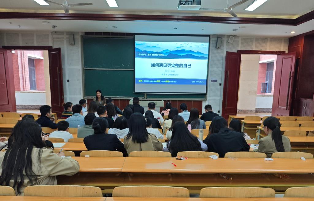 2024年4月24日14:00,学校学工部在2023-2024学年第二学期组织的“学工课堂”第一讲专题讲座在2305阶梯教室举行,学工部部长冉小平如何遇见更完整的自己为主题开展讲座,各学院书记、专职辅导员60余人参与。