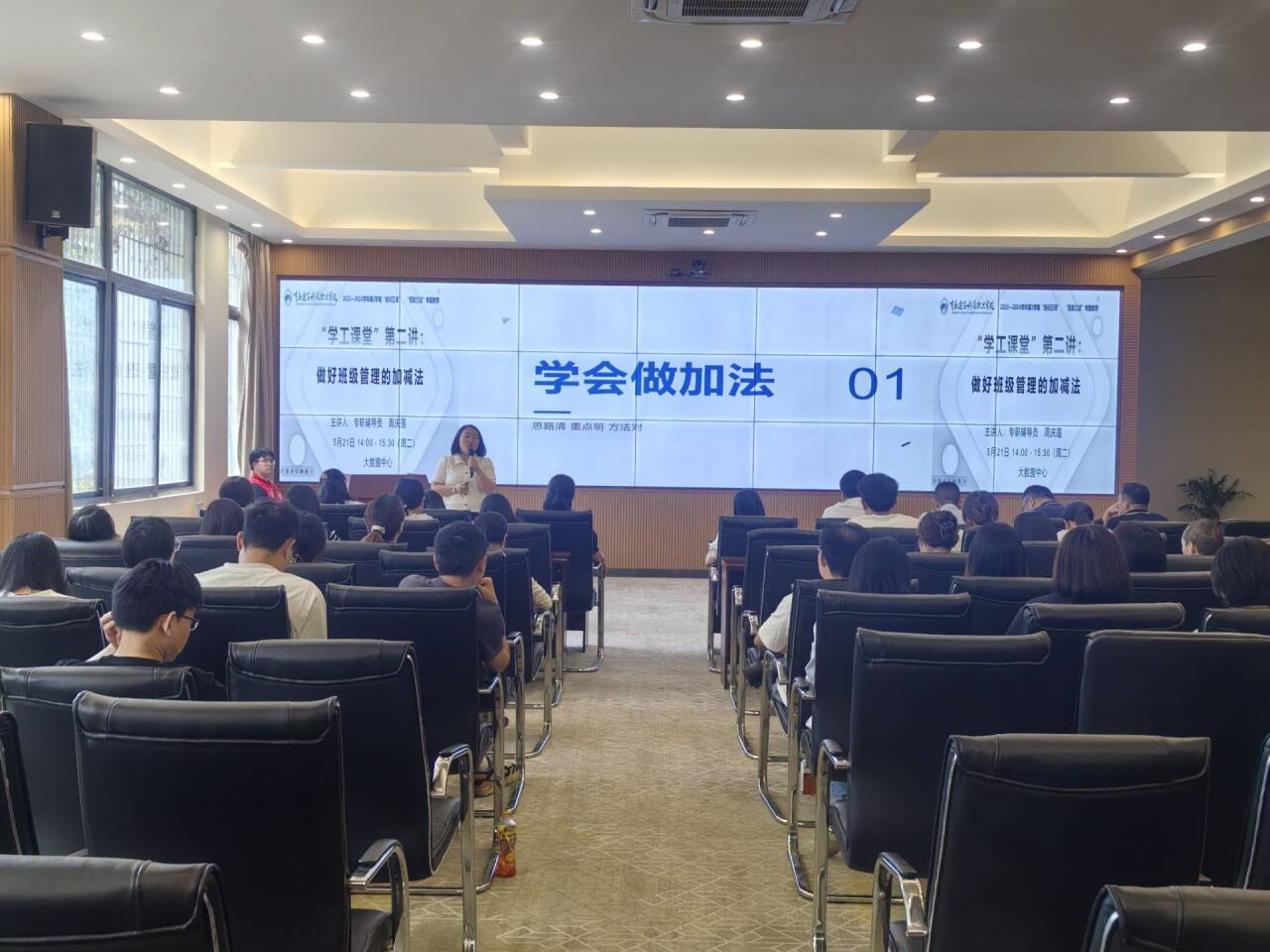 2024年52114:00,学工部在2023-2024学年第一学期组织的“学工课堂”第二讲:做好班级管理的加减法专题讲座在大数据中心举行,由房地产营销学院辅导员周庆莲老师主讲学工部长冉小平、全体书记、专职辅导员共60余人参与。