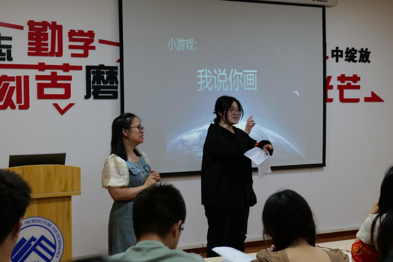 讲座刚开始,周老师通过给大家讲了一个关于秀才买柴的故事和“我说你画”小游戏告诉大家团队沟通是人与人之间、人与群体之间思想与感情的传递和反馈的过程,有效的沟通能够促进团队成员之间的理解和合作,提高工作效率,解决问题,实现共同目标。