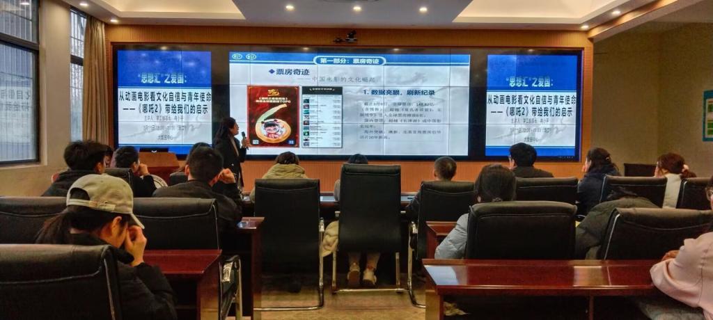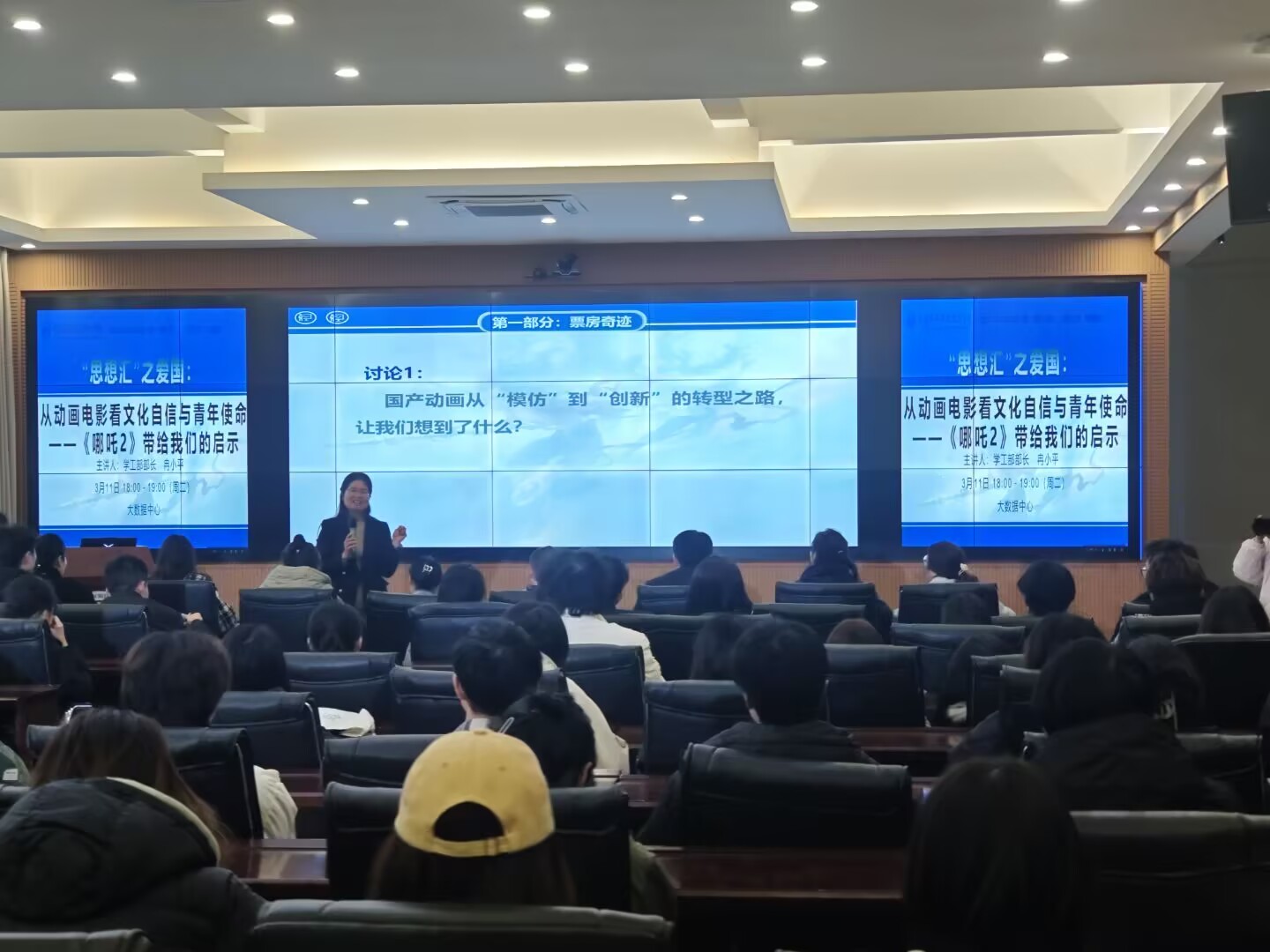 2025年3月11日下午18:00,学校学工部组织的2024-2025学年第二学期“思想汇”之爱国:从动画电影看文化自信与青年使命——《哪吒2》带给我们的启示专题讲座在大数据中心举行,由学工部部长冉小平主讲,值班书记、辅导员以及在校学生代表共90余人参加。