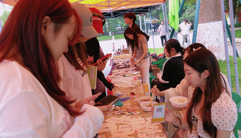 这里的商品琳琅满目,让人目不暇接。瞧,那一排包装精致的项链,在阳光下闪着微光,简约的设计、小巧的吊坠,无论是日常佩戴还是搭配小裙子,都能瞬间提升时尚感;手机壳专区更是丰富多彩,有可爱的海绵宝宝图案,充满童趣,仿佛能把人带回童年时光;还有梦幻的星球元素,神秘又浪漫,每一款都让人爱不释手。贴纸摊位也人气爆棚,可爱的凯蒂猫、酷炫的骷髅图案,各种风格应有尽有。同学们在摊前,精心挑选,准备用这些小贴纸为自己的笔记本、手机增添个性。除了这些,还有散发着文艺气息的书籍、实用的文具、漂亮的小饰品……每一件物品都带着前主人的故事,等待着新的缘分。