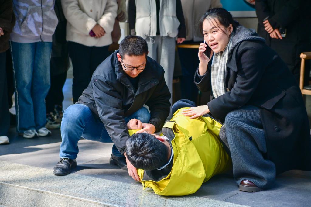 演练模拟场景设定为午餐高峰时段,一名学生在食堂用餐后,突然出现恶心、呕吐、剧烈腹痛,并伴随胸闷、憋气、呼吸困难等严重症状。身旁同学发现异常后,立即大声呼救,现场气氛一度紧张。同学们临危不乱,迅速分头行动:一名同学第一时间拨打120急救电话,清晰说明事发地点、人员情况及症状;另一名同学则立即向辅导员田振老师报告险情;同时,其他在场同学尽力维持秩序,并安抚患病同学。