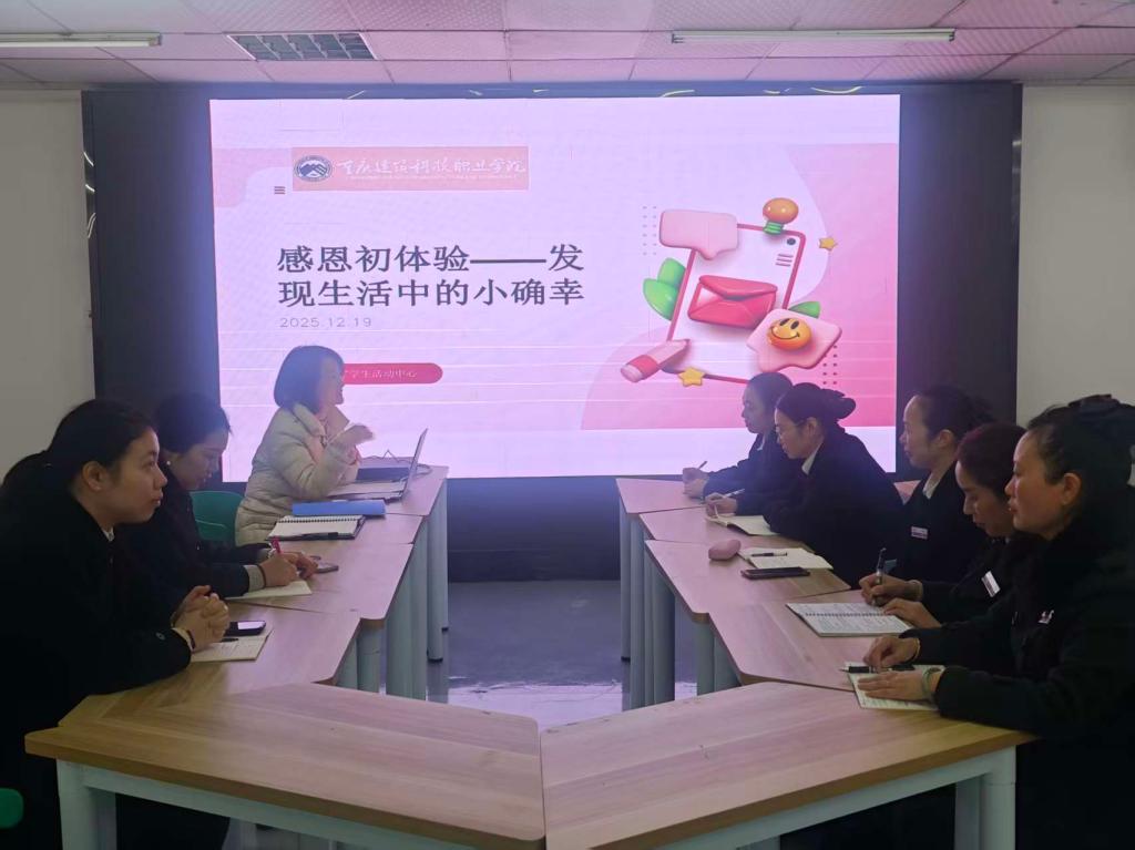 为提升宿管团队的服务意识与人文关怀能力,帮助宿管老师在日常工作中发现美好、传递温暖,宿管中心于2025年12月19日在“一站式”学生社区服务中心开展了以“感恩初体验——发现生活中的小确幸”为主题的专题培训活动。本次活动旨在引导宿管老师通过感恩体验,增强心理性,提升服务育人的实效性与感染力。