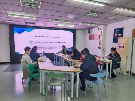 大学生心理健康教育是高校思政工作与 人才培养的重要组成。为了让辅导员能够深入了解学生心理,主持人带领辅导员深入了解高校心理健康教育的三大政策,从而更好地处理学生心理健康方面的问题,辅导员“跃迁+”发展共读会于2026年3月3日星期二晚上八点在一站式服务中心举行。本次共读会由智能制造学院黄银荣老师主持,值班书记张运来书记及各二级学院辅导员共同参与。