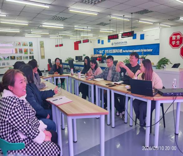 本次共读会以“人人升本”与产教融合”为主题,为了让辅导员处理问题能力得到更好地提升,辅导员“跃迁+”发展共读会于2026年3月10日星期二晚上八点在一站式服务中心举行。本次共读会由学生处陈敏主持,学工部部长冉小平、值班书记张红琼及各二级学院辅导员共同参与。