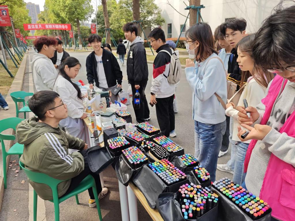 上午十点,跳蚤市场正式开张迎客。平日里安静的香樟大道瞬间变身熙攘的“微型商贸街”。各色摊位沿着道路两侧整齐排开,摊位上琳琅满目的商品令人目不暇接:从伴随学子无数个日夜的考研资料、专业笔记,到装点过宿舍温馨时光的玩偶摆件;从九成新的生活用品、电子产品,到同学们亲手制作的漆扇、手工艺品和原创插画。“走过路过,不要错过!”“买书送笔记,学长亲测‘高分秘籍’!”为了招揽顾客,各位“摊主”纷纷使出浑身解数。他们不仅是卖家,更是青春故事的讲述者。