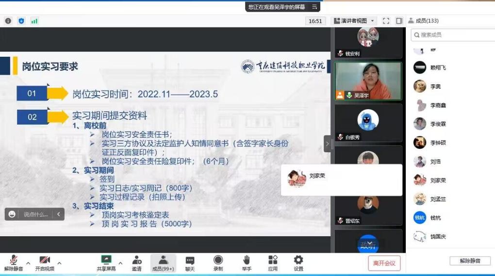 为了推动毕业生顶岗实习工作的顺利开展,2022年11月22日,云计算应用与计算机网络技术专业2020级毕业生顶岗实习启动会在线上举行。云计算教研室全体老师与两个专业顶岗实习学生参加会议,此次会议由教研室主任吴泽宇老师主持。