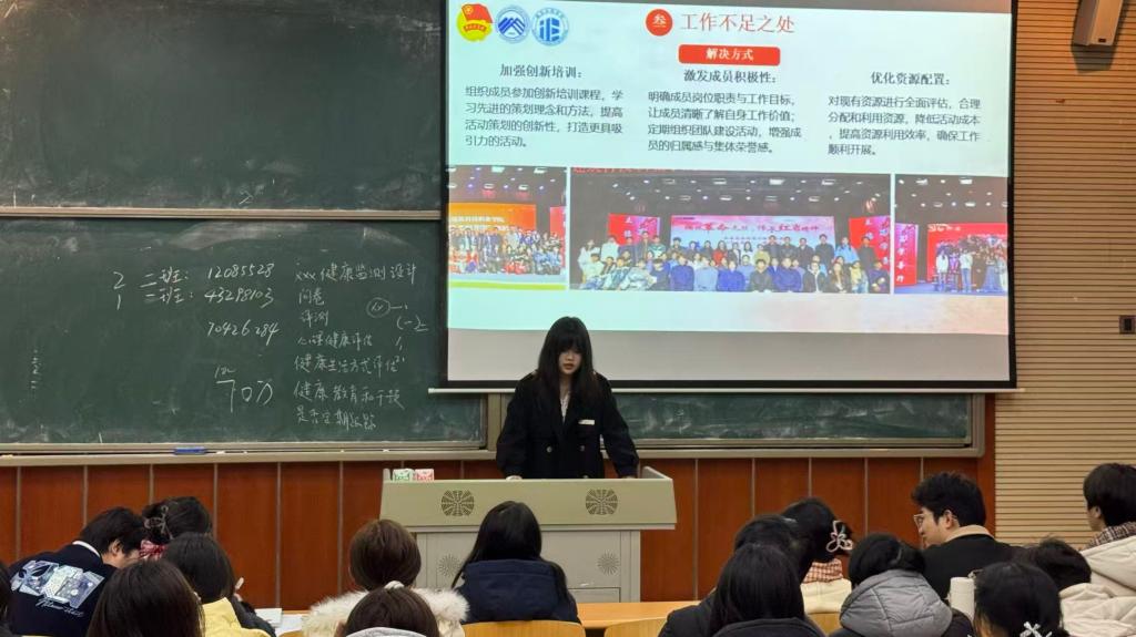 随后,各部门负责人依次汇报学期工作。学习部部长叶靖榆聚焦早操组织与早自习管理两大核心职责,全面汇报了本学期在早操出勤督导、晨读秩序维护、早自习纪律规范等方面的具体工作开展情况。文体部部长吴文斌围绕各类活动策划与筹备工作展开述职,系统总结了校园文化节、体育赛事、文艺汇演等活动的前期方案设计、流程对接协调、物料筹备及现场执行等全流程工作,同时反思了工作中的不足并提出优化方向。权益部部长贺艺丹针对同学诉求收集、问题反馈处理等权益服务工作进行了详细阐述;创新创业发展部部长王雪则分享了创新创业赛事组织、创业指导服务等工作的推进情况,各位部长均实事求是地梳理了工作亮点与短板,并明确了后续改进措施。