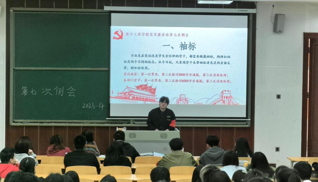 会前党员服务站数字工程学院纪检部部长何杰对参会人员袖标的佩戴进行检查对遵守佩戴规则的同学给予肯定,并对未佩戴袖标的同学提出要求。他表示作为分站成员佩戴袖标不仅代表自己更代表着作为分站的一份子应接受校全体同学的监督以身作则树立榜样。