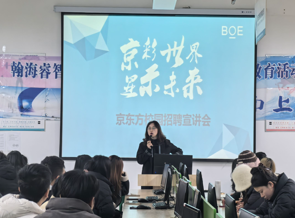 紧接着,京东方人事代表开启一场精彩的企业及岗位介绍之旅。通过 PPT 演示,结合详细的数据与生动的现场视频案例,详细解读了实习岗位、薪酬待遇以及对应的职业晋升通道,清晰描绘出同学们在企业成长发展的蓝图,引得台下学生们眼神中满是对实习生活的憧憬。