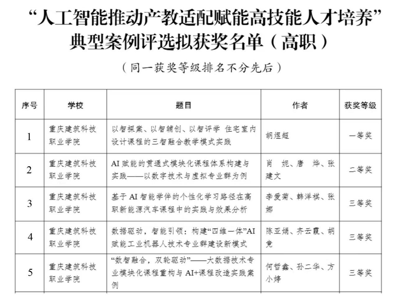 近期,由重庆市教育科学研究院办公室组织开展的“人工智能助力产教适配赋能高技能人才培养”典型案例评选活动圆满结束,评选结果已正式揭晓。我院选送的《“数智融合,双轮驱动”—大数据技术专业模块化课程重构与AI+课程改造实践案例》荣获三等奖。此案例由数字工程学院院长孙二华老师、大数据教研室主任何哲鑫老师以及校企合作企业翰海睿智公司产教融合部部长方小婷共同完成,是校企深度合作、协同育人的又一项重要成果。