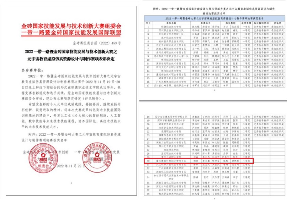 喜报:数字工程学院虚拟现实专业在2022年金砖国家职业技能大赛首届《元宇宙教育赛项》中荣获佳绩