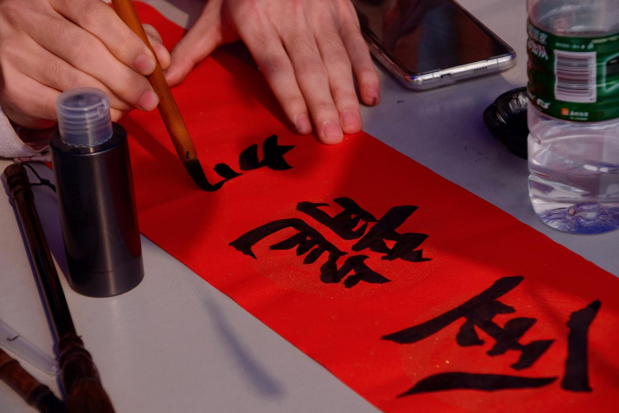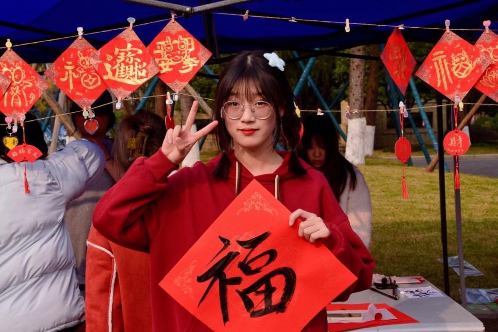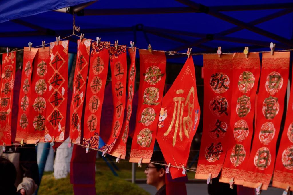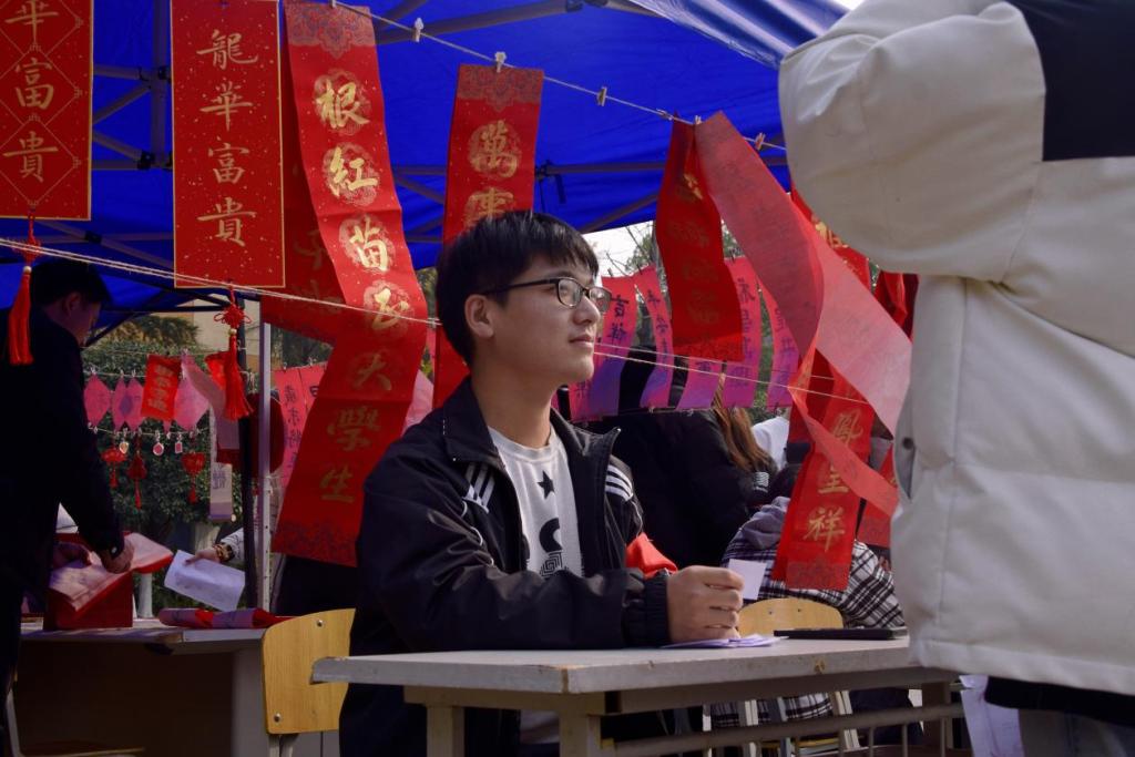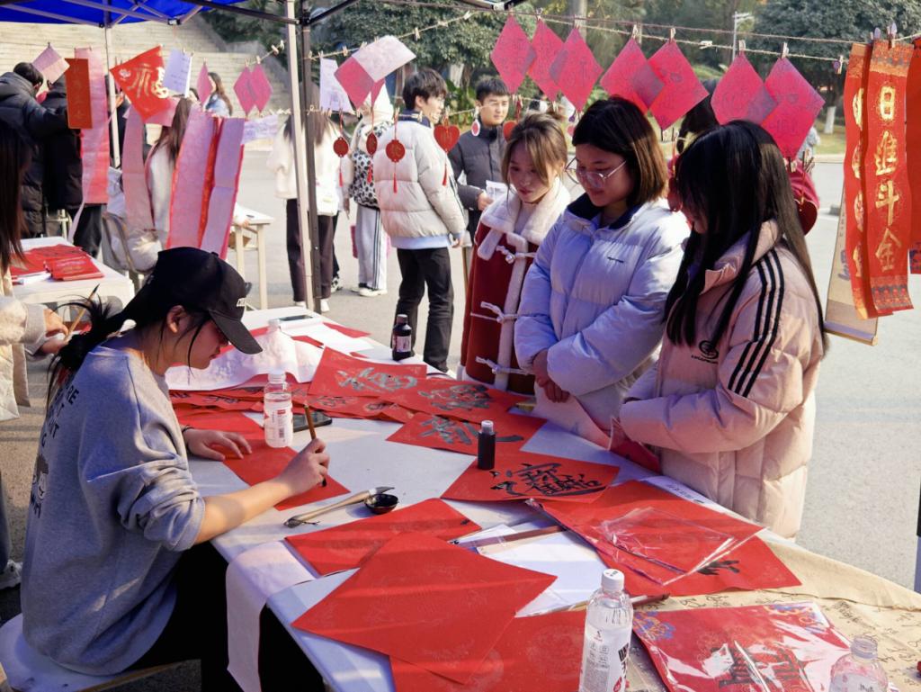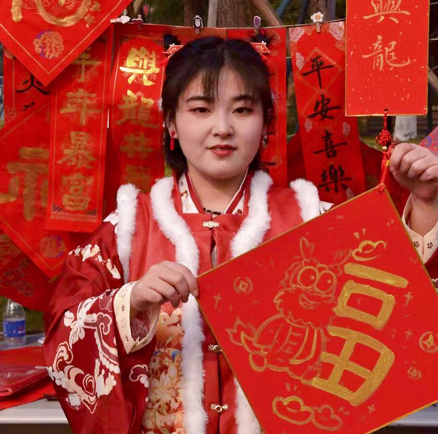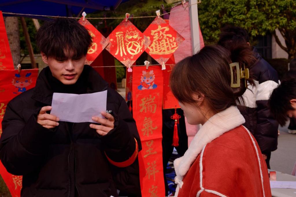 阵阵墨香指尖流,幽幽韵味心脾沁,笔尖的金粉和红色的宣纸漾开成一幅春联。师生驻足屏息观赏、仔细体味,有的精心挑选着自己喜欢的福字和对联,还有的帮助工作人员铺纸研墨,助添书写春联的激情。一副副平安和谐、吉祥如意的春联,带着挥别兔年、喜迎龙年,辞旧迎新的美好祝愿。