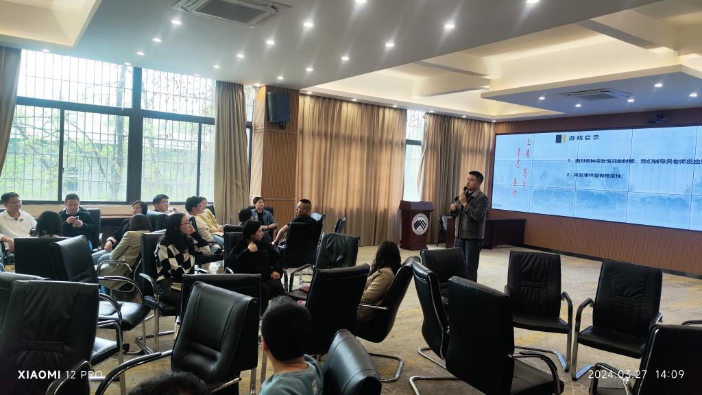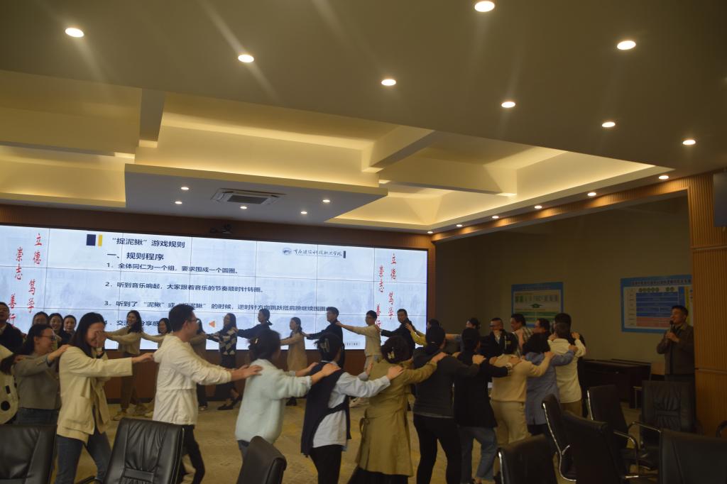 活动开始,樊老师组织“破冰游戏”——“抓泥鳅”来进行活跃气氛。樊老师介绍完游戏规则,音乐响起各位领导与老师积极参与其中,通过“抓泥鳅”的游戏,现场的氛围也络起来,随着音乐的结束,游戏也紧接着落幕,各位领导与老师陆续回到座位。樊老师对第一轮的游戏的含义与感受提出“我们辅导员老师面对各种突发情况时,应该反应迅速,对突发事件有预见性。在座的各位老师也给予肯定与同意。在通过樊老师的发言后,第二轮游戏也迎来了开始,解读规则后,老师们分为两组进行游戏,在老师欢声笑语下,游戏也落下帷幕。樊老师也再次对第二轮游戏的启示提出,每个老师应该充分认识自己,充分认识学生等的结论。