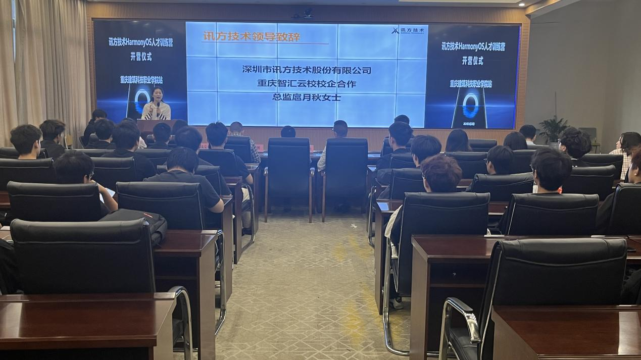 紧接着,讯方技术公司重庆区域智慧云校校企合作总监扈月秋女士也做了重要讲话,对鸿蒙做了相关介绍以及学员们的未来发展给予了高度评价,并表示将全力支持鸿蒙训练营的开展,对同学们提出了期望。