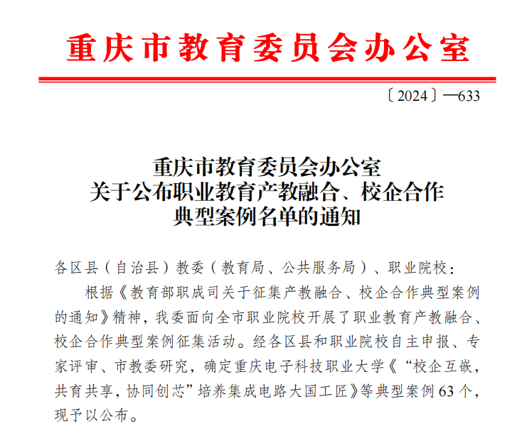 2024年11月13日数字工程学院的产教融合项目“打造产教融合智慧教育体系,数智赋能数字技术工匠培养”荣获重庆市教育委员会办公室公布的职业教育产教融合、校企合作典型案例,标志着我院在职业教育领域的创新实践获得官方高度认可。