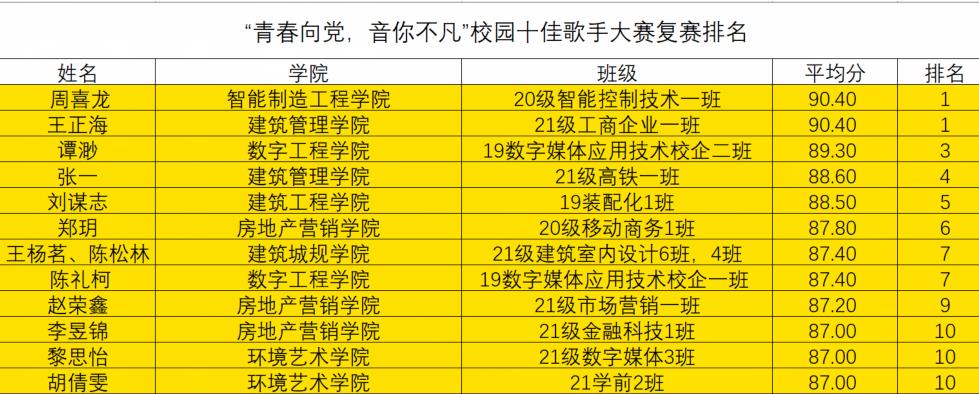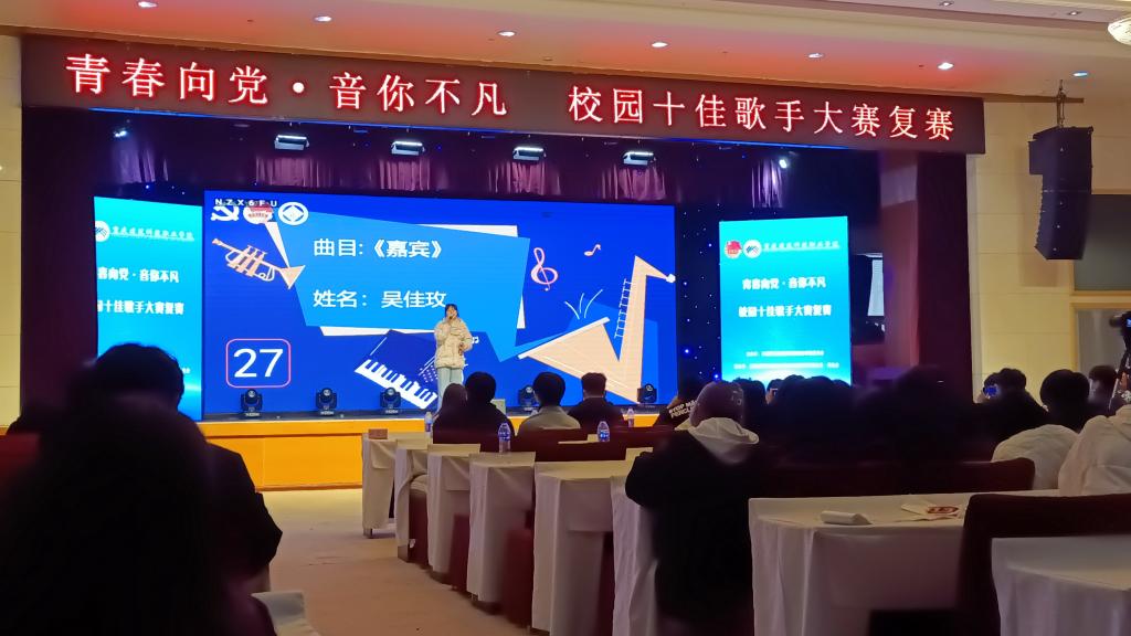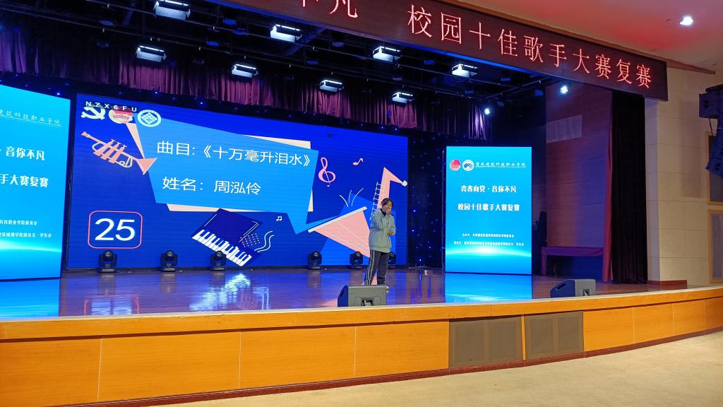 本次大赛主题为“青春向党,音你不凡”。经过一个月的层层筛选,共有30名选手在160多名参赛者中脱颖而出,进入复赛环节。本次大赛的评委们来自个各个二级学院以及社团,分别是智能制造学院团总支书记徐杨,建筑管理学院团总支书记卢游,环境艺术学院团总支书记李小霞,以及吉他社林明媚同学、艺术中心陈炼华同学等。评委们秉持着公平公正对选手们进行打分,参赛选手们的歌声从这里传递,青春从这里激荡,梦想从这里启航。分别带来了《乌兰巴托的夜》、《安静》、《一颗会开花的树》……选手们用他们美妙的歌声感染者观众们的心灵。