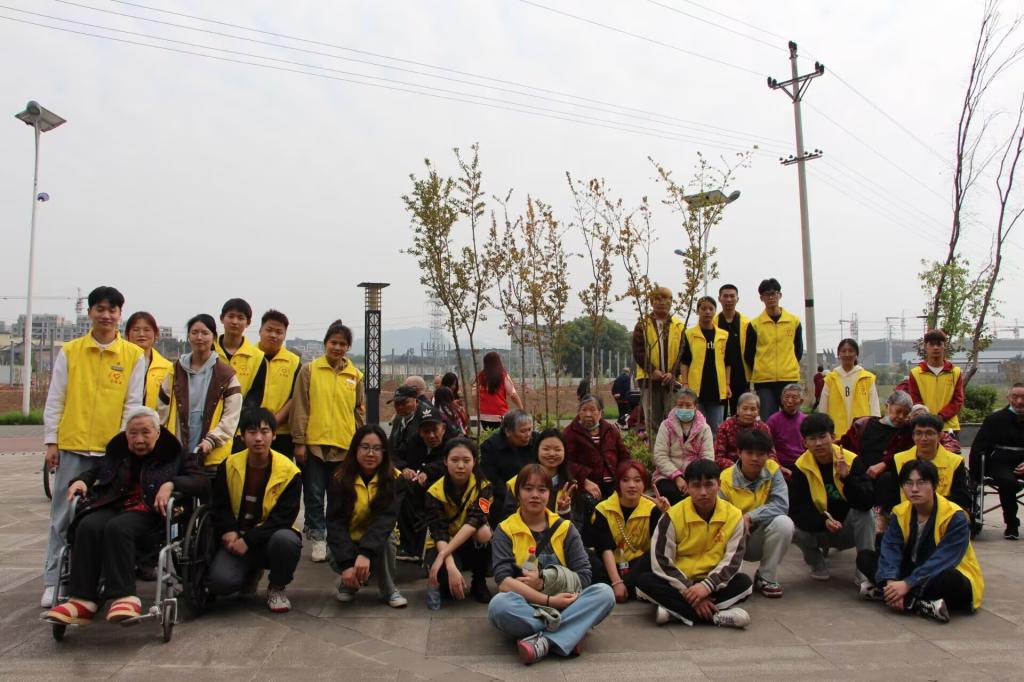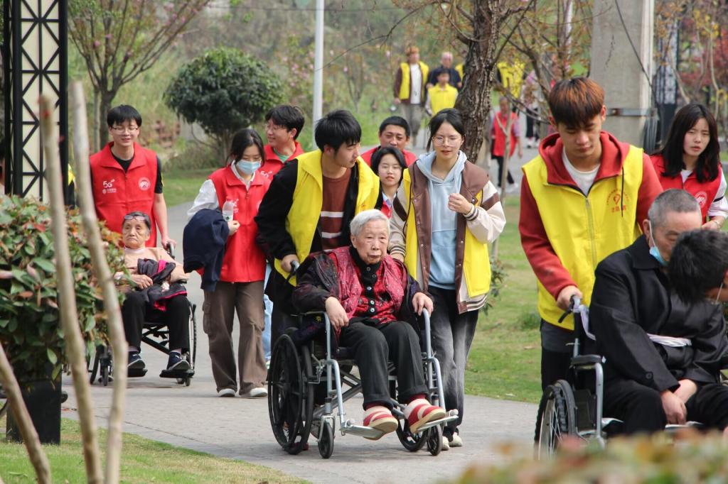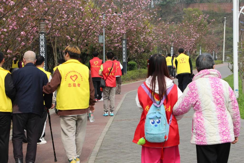 从学校到养老院步行约三十分钟,到达养老院后,志愿者们在工作人员的带领下,带着养老院的爷爷奶奶们到陈家桥滨河公园踏青。爷爷奶奶的年纪都比较大,大多都有一些身体疾病,有的需要两人搀扶着慢慢前行、有的坐着轮椅、有的听力不好、有的步行几米后需要坐下休息喘气……但是志愿者和爷爷奶奶的相处还是比较愉快,他们陪着爷爷奶奶聊天、谈心,给他们讲学校的故事,听爷爷奶奶讲自己的子孙等等,爷爷奶奶说他们已经有两年多未走出过养老院了,这次踏青让他们再一次看到了春暖花开,重新体验了大自然的美好。