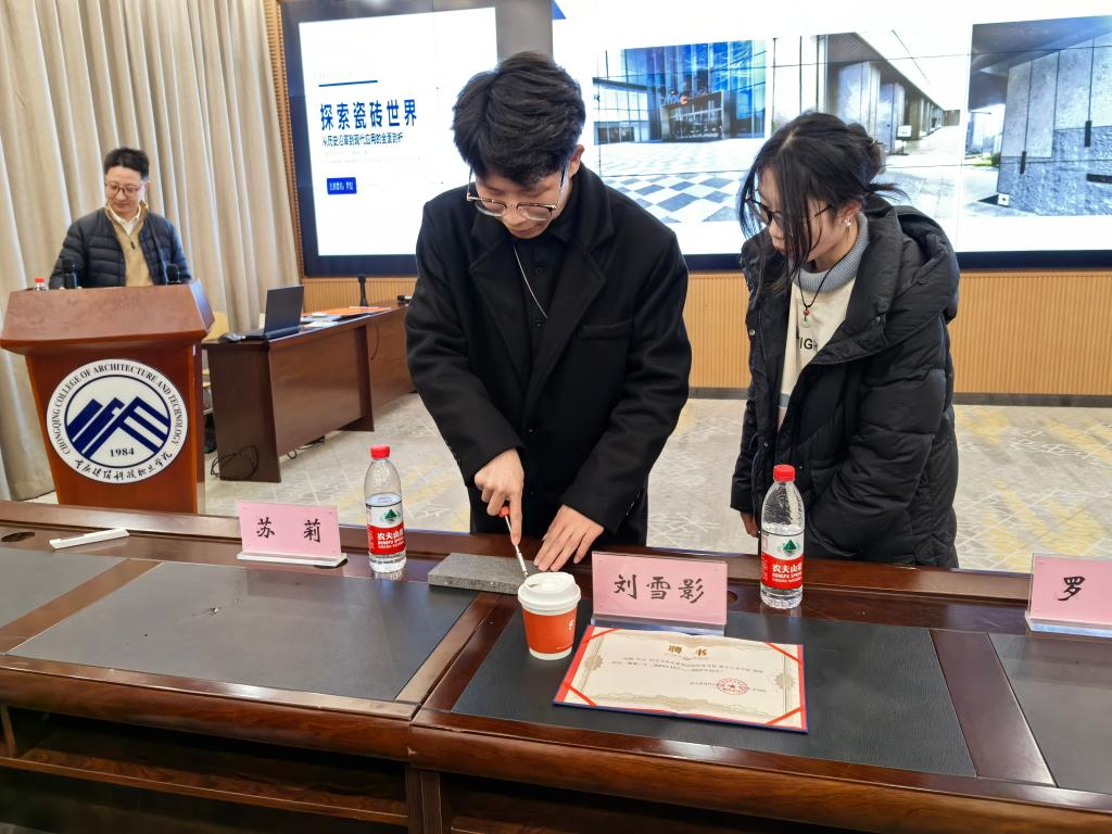 在热烈的掌声中,罗昆专家开始了他的专题讲座。他从瓷砖的起源讲起,详细阐述了瓷砖的分类、施工技术、维护清洁、在现代建筑中的应用与前景以及商业分析与决策等内容。深入浅出,既有理论知识的讲解,又让学生亲身实践体会,让在场的师生受益匪浅。